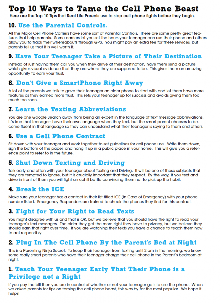 Here are the Top 10 Tips that Real Life Parents use to stop cell phone fights before they begin.